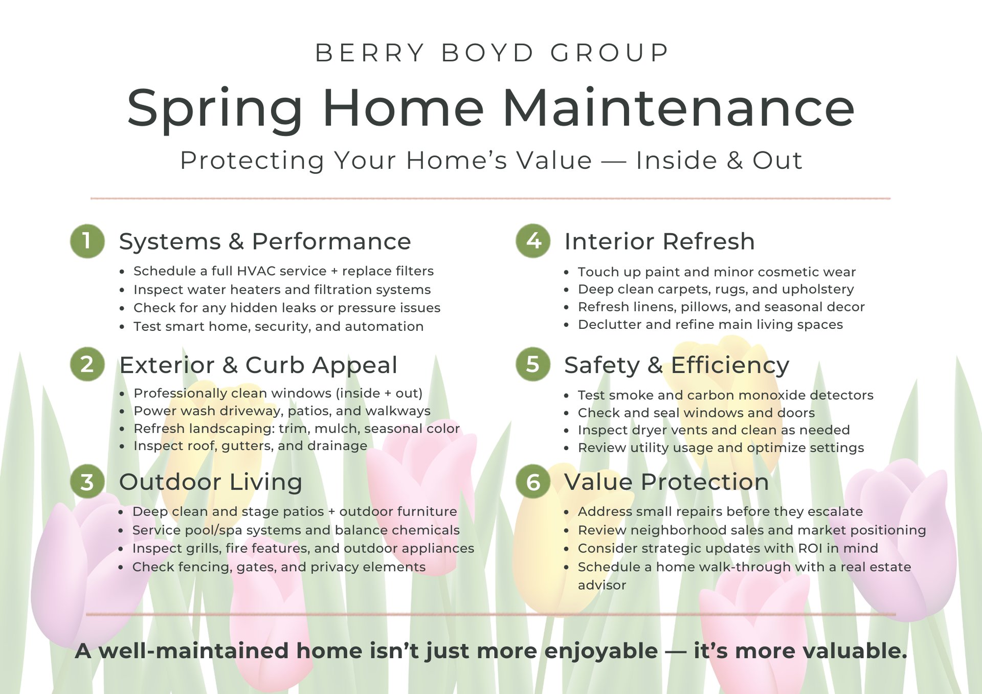 At Berry Boyd Group, we believe homeownership is about more than just buying and selling—it’s about protecting and maximizing your investment. If you need recommendations for trusted service providers or want guidance on which updates add the most value, we’re always here to help.